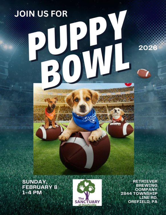 Join us at Retriever Brewing Company for some pre-game puppy fun on Sunday 2/8/26 from 1-4pm. Meet our adoptable puppies, grab some delicious food and drinks, and get ready for the big game! We