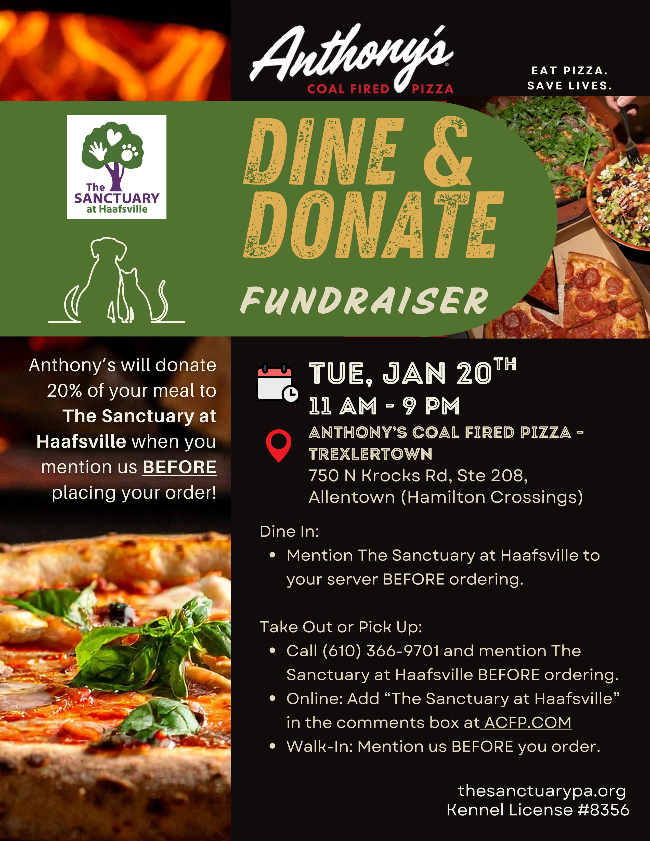 Please join us for a Anthony's Coal Fired Pizza & Wings fundraiser to benefit The Sanctuary at Haafsville on Tuesday, January 20th from 11am - 9pm.