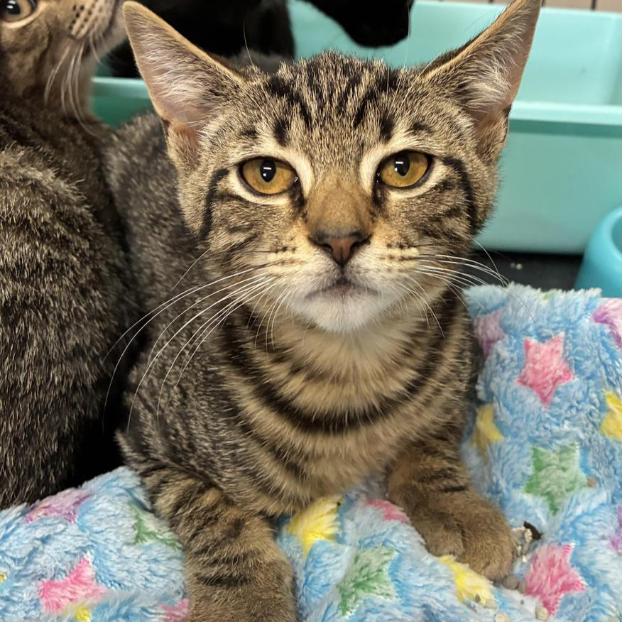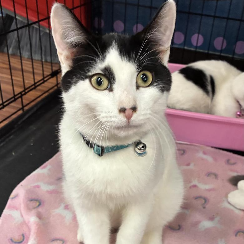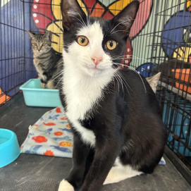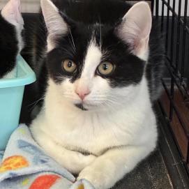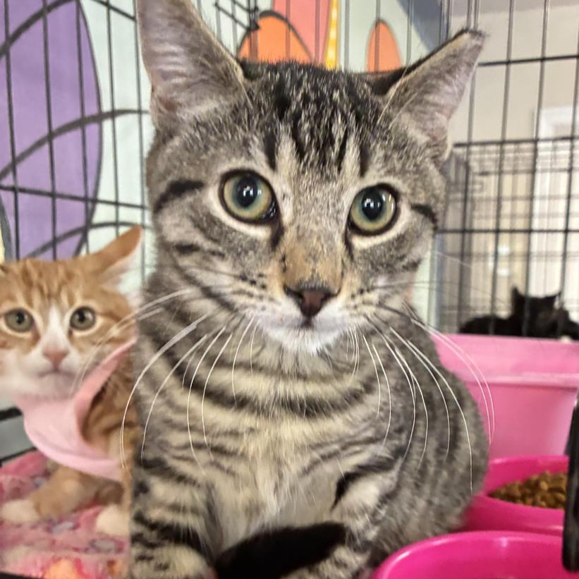 Shadow a boy who loves to eat and then play with his siblings. He also loves string toys and jumping on scratch post. He may seem shy or nervous but once you start to pet him in his favorite spots