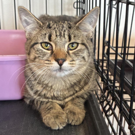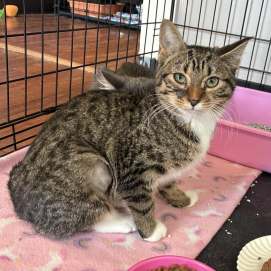 I am a sweet and playful girl. I might take a little while to be your friend, but once I do, I will greet you with purrs, jump on your lap and follow you around. I am food motivated and especially