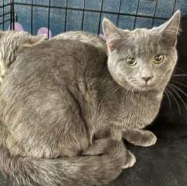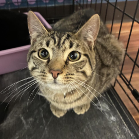 Chex is very friendly. She enjoys sitting in your lap for attention and cuddles. Her favorite toys are springs and wand toys.