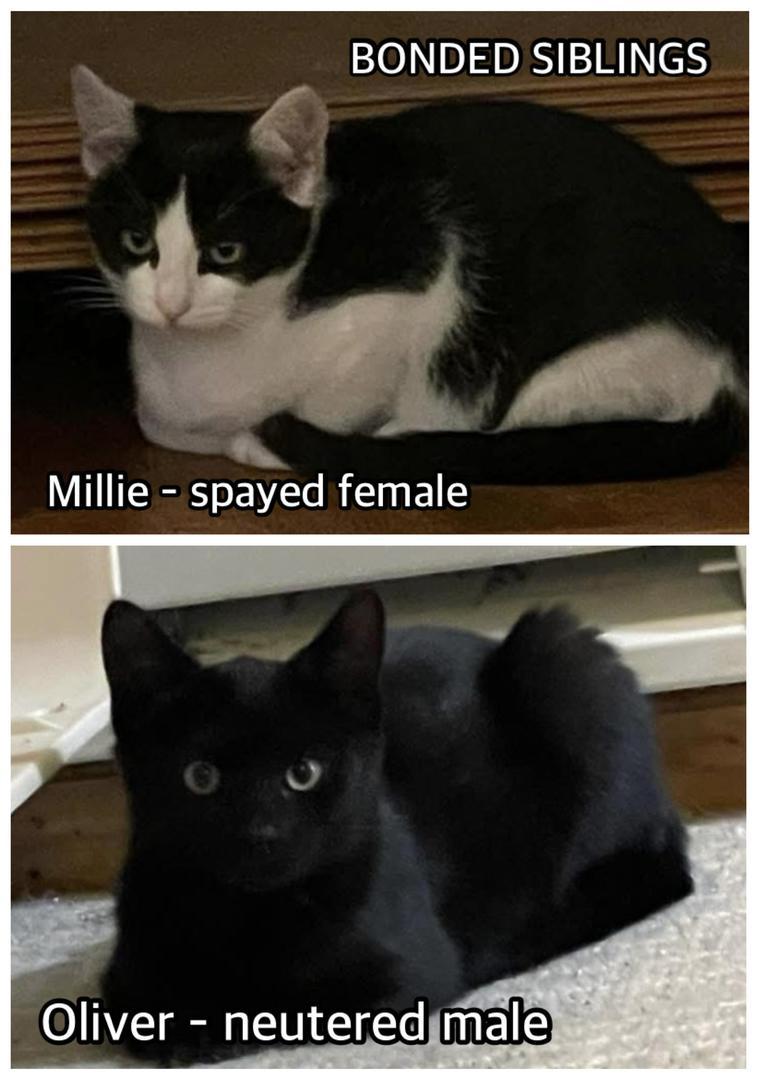 Millie and Oliver are about 5 months old, healthy, spayed/neutered, vaccinated, negative for FeLV/FIV, litter trained and microchipped