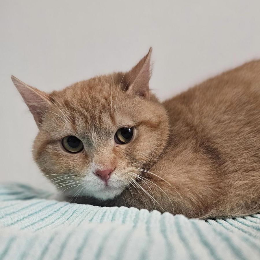 Augustus is missing his tail. He is timid but slowly learning how to trust people. He hisses softly when he is approached and feels threatened, but he has